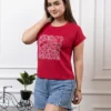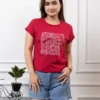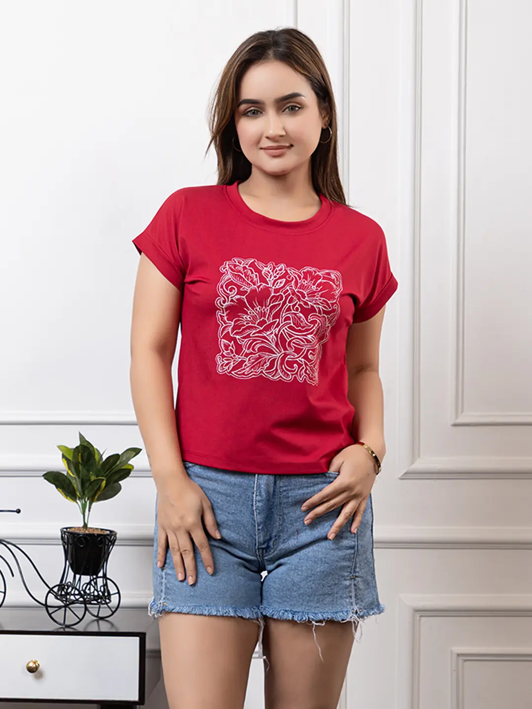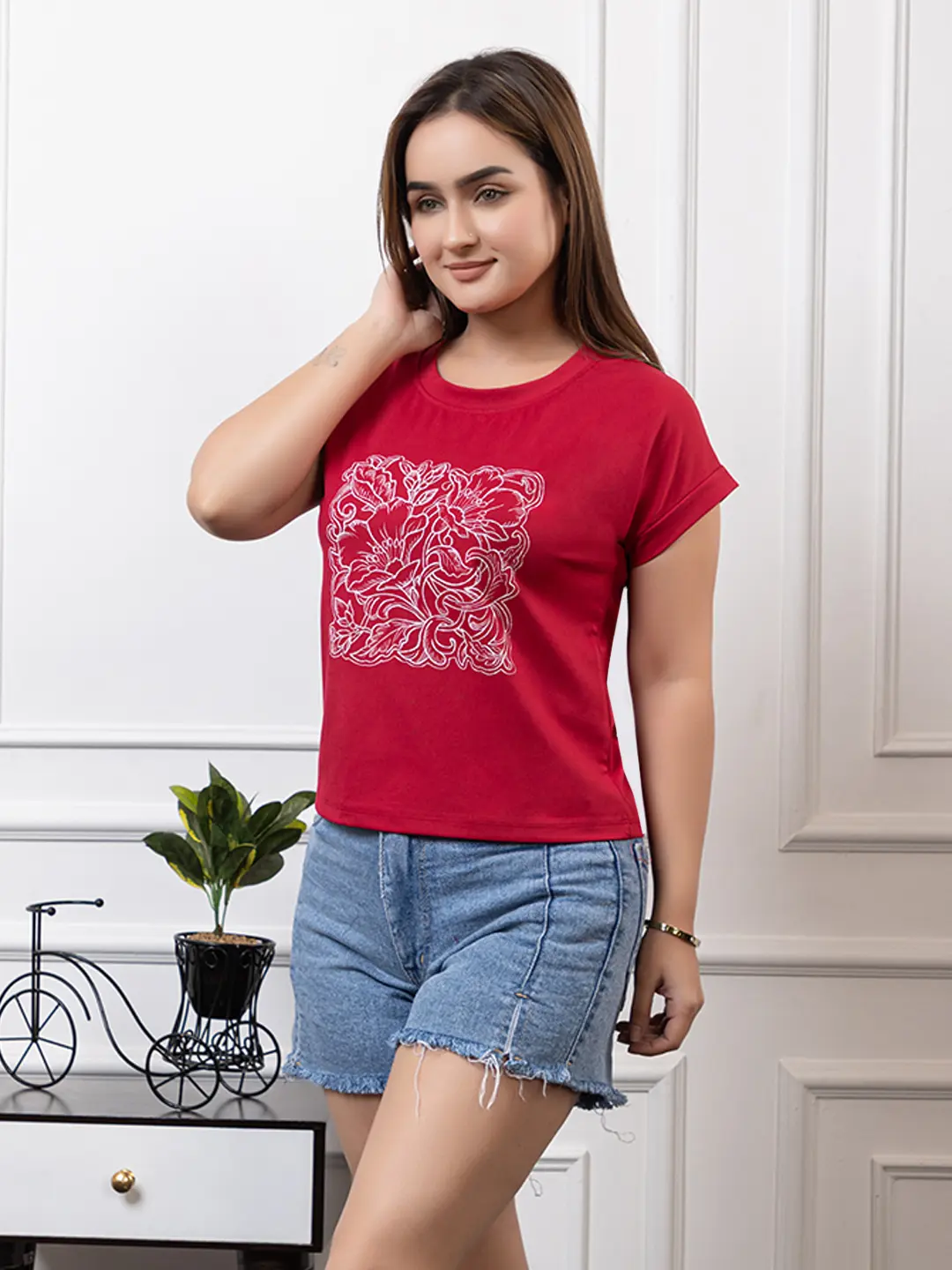 Add a pop of passion to your look with this vibrant red T-shirt featuring a delicately hand-painted floral motif at the center. Crafted for comfort and confidence, it offers a flattering fit with rolled sleeves that elevate the casual vibe. Perfect for everyday wear, brunches, or when you want your style to speak softly but stand out.