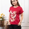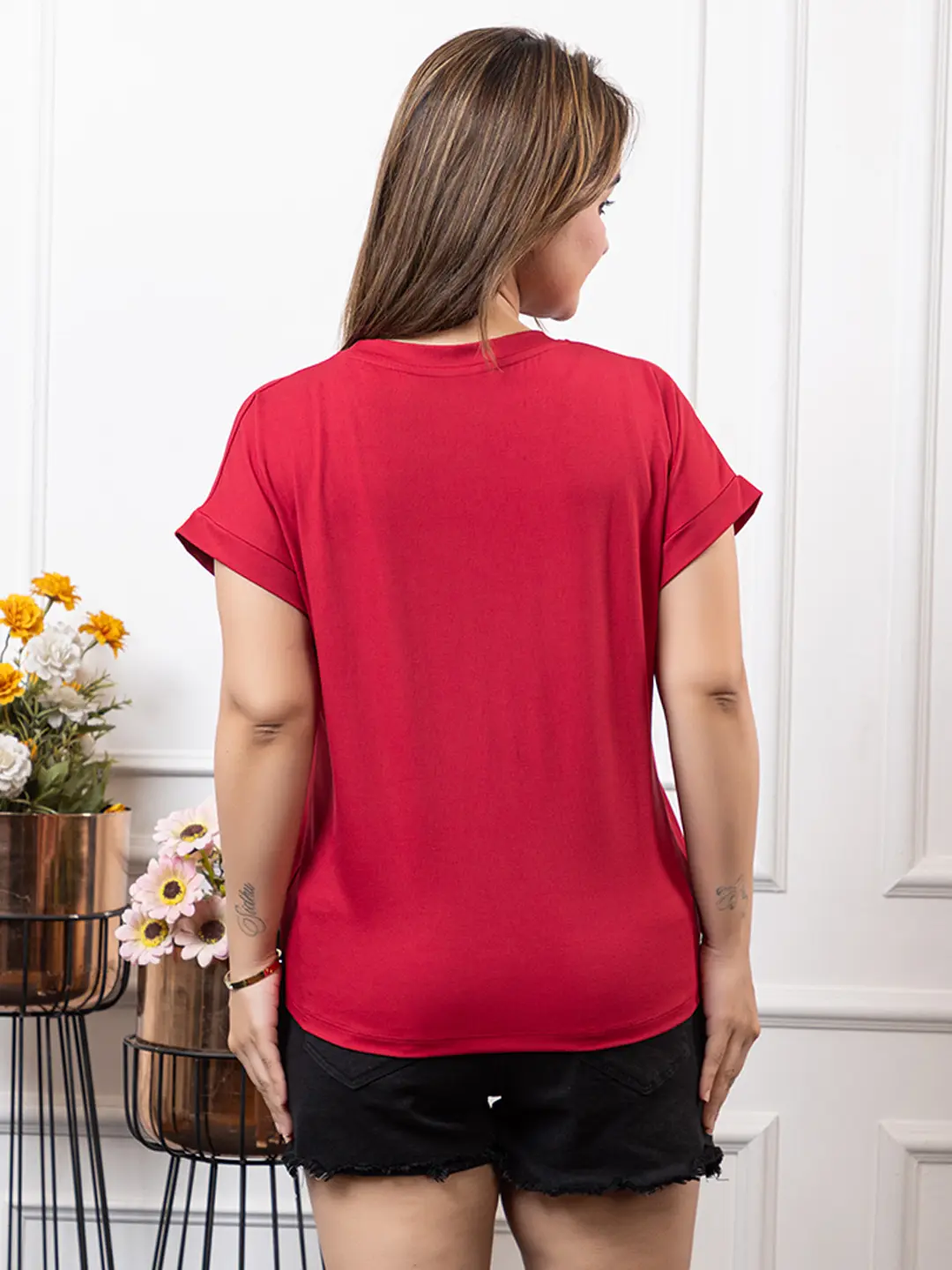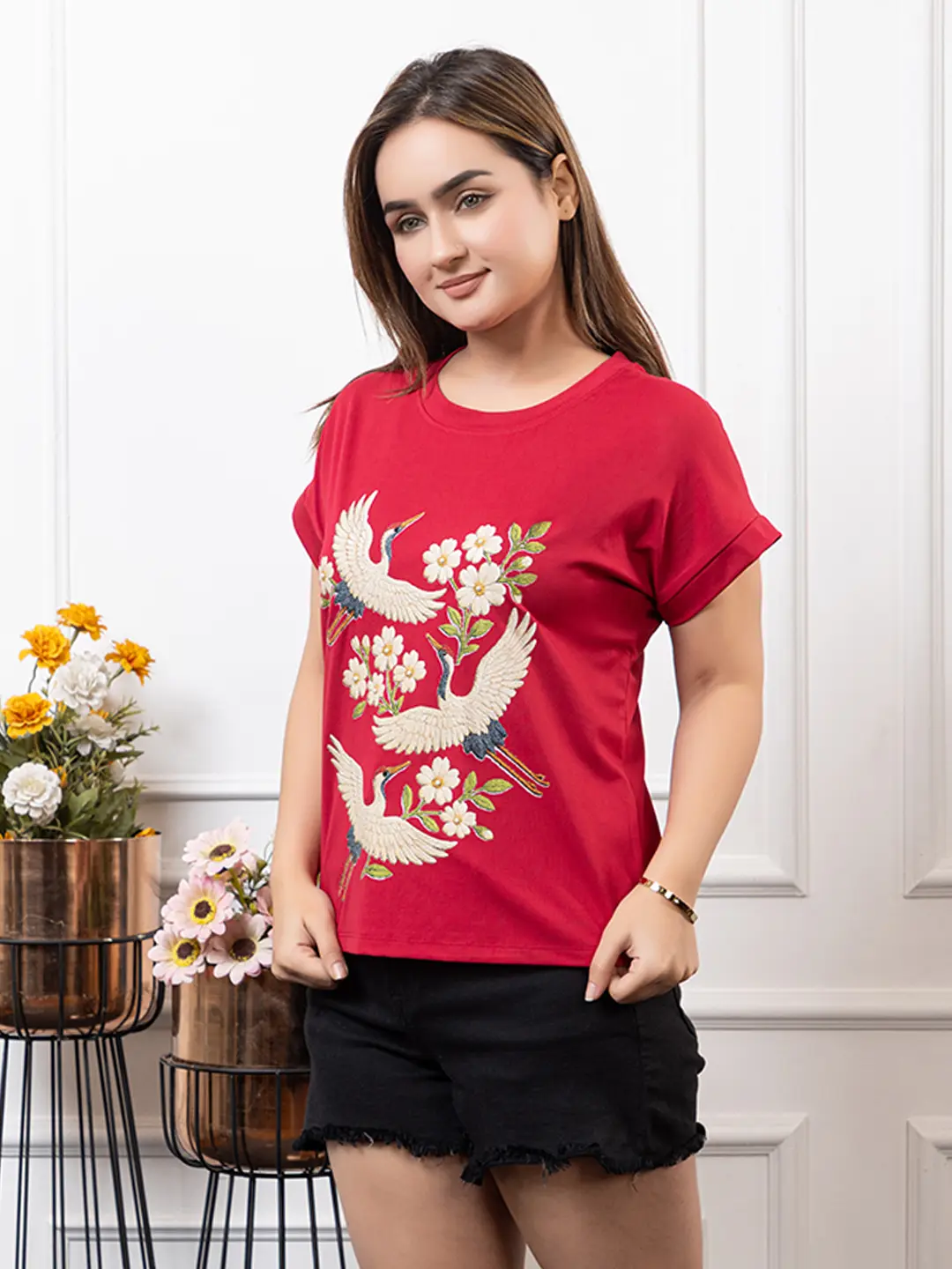 Turn heads with this beautifully crafted medium-length T-shirt, designed to celebrate bold femininity. Featuring a stunning 3D print enhanced with delicate pearl detailing, this piece brings art and elegance to your everyday style. The rolled sleeves add a casual yet chic touch, making it perfect for both relaxed outings and stylish occasions.
