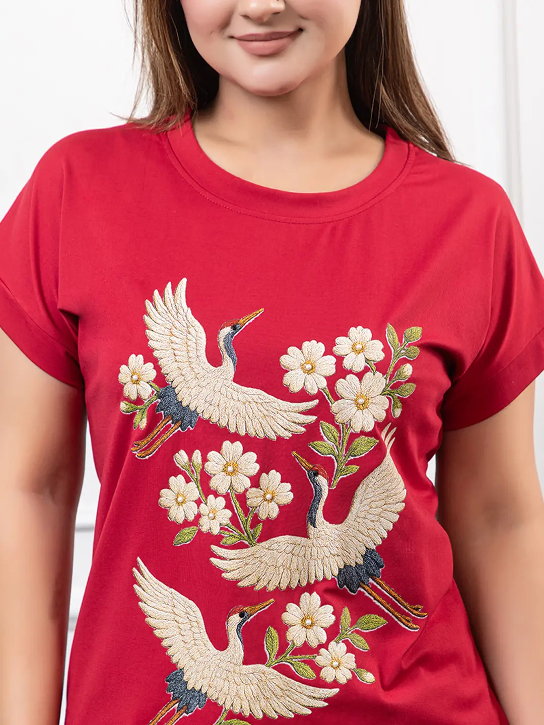 Cranes In Bloom 3D Graphic printed Pearl Detailing T-shirt