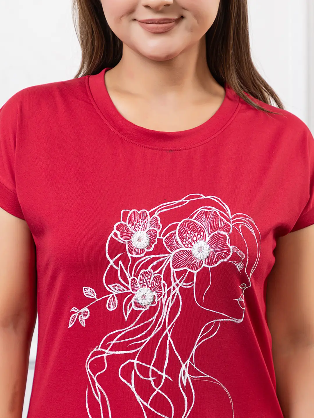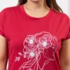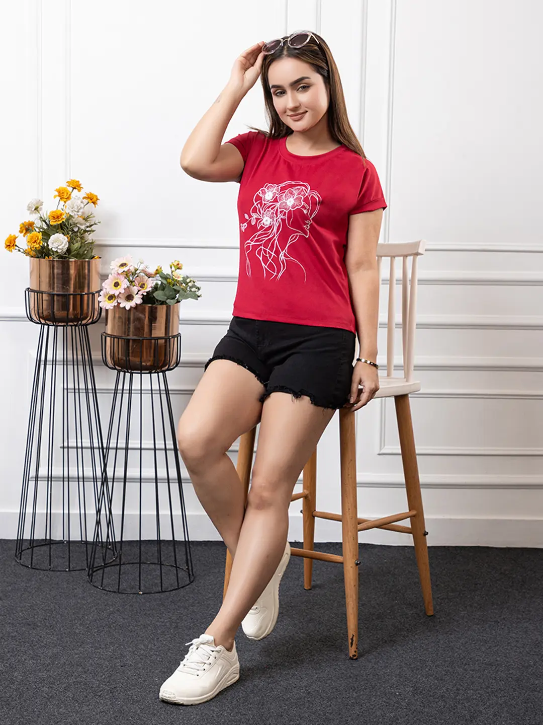 This hand-painted T-shirt features a dreamy girl adorned with beautiful hair accessories, bringing art to life on fabric. With rolled sleeves and a medium length, it’s a perfect blend of creativity and comfort—ideal for every occasion.