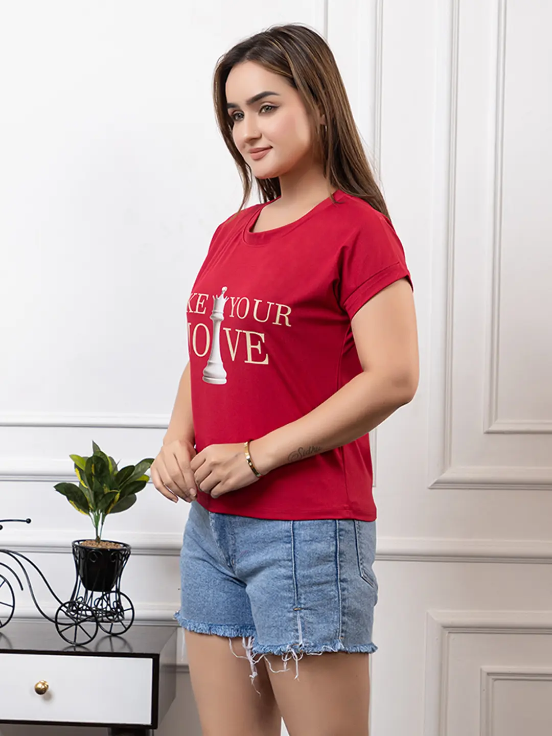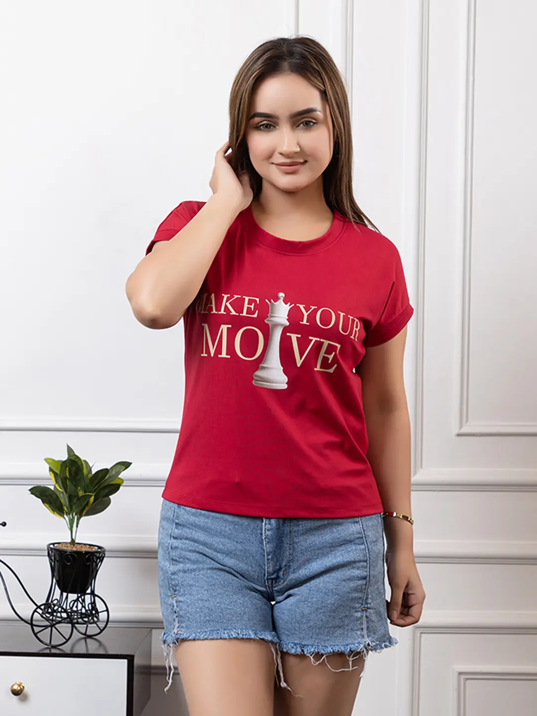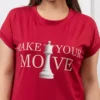 Step into your bold era with this fierce red tee that speaks volumes—without saying a word. Featuring a 3D chess queen motif and the empowering words “Make Your Move,” this piece is designed for the woman who owns her space. Finished with subtle pearl detailing and rolled sleeves for that modern edge, it’s tailored for confidence, comfort, and every occasion.